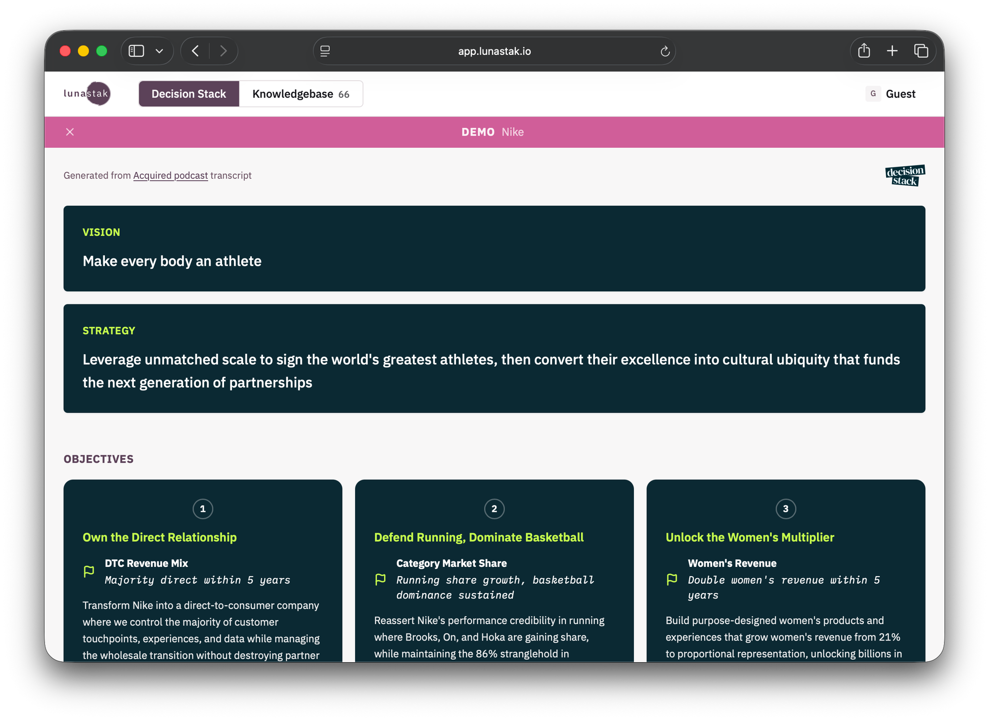 That alone would be worth writing about. But Jonny did something clever. He's used Lunastak to break down Acquired podcast episodes into Decision Stacks โ initially as a stress test for the analysis engine at the heart of the product. The results were compelling, and the learning helped him improve it further. What's left is a learning opportunity: you can actually see, laid out visually, how a company like Nike's strategy decomposes into a Decision Stack based on the story told in the Acquired episode.