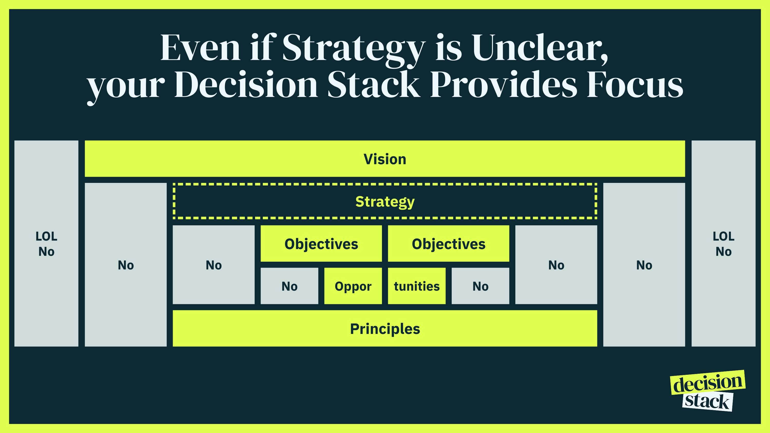 Even if your company's capital-S Strategy is lacking, you have more guidance than you think. Your Decision Stack โ particularly your Principles โ can act as a strategic filter. As I've written about in why your values are useless, Principles need to be specific and actionable. The best format? Even/over statements that force real tradeoffs: