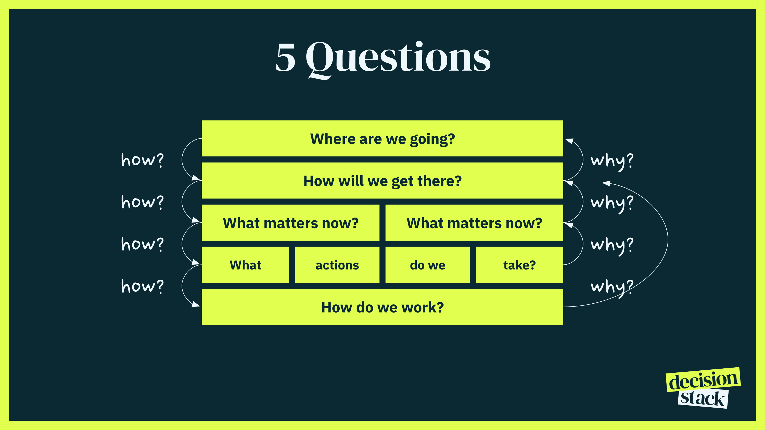 These five questions form a stack. Each answer should flow from the one above it, creating a clear line from the highest-level ambition to the smallest daily decision. When the stack is complete and coherent, decisions become easy. Teams know what to do without asking. Momentum becomes natural because clarity is built into the structure itself.