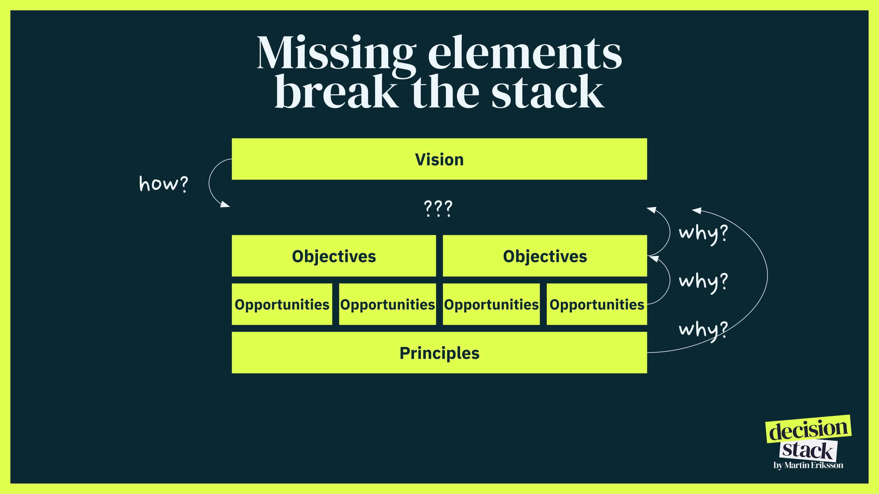 Read the stack from top to bottom, and every level answers: How are we going to do this? Your vision answers how you'll change the world. Your strategy answers how you'll achieve that vision. Your objectives answer how you'll execute that strategy. Your opportunities answer how you'll achieve your objectives. Your principles answer how you'll approach the work.