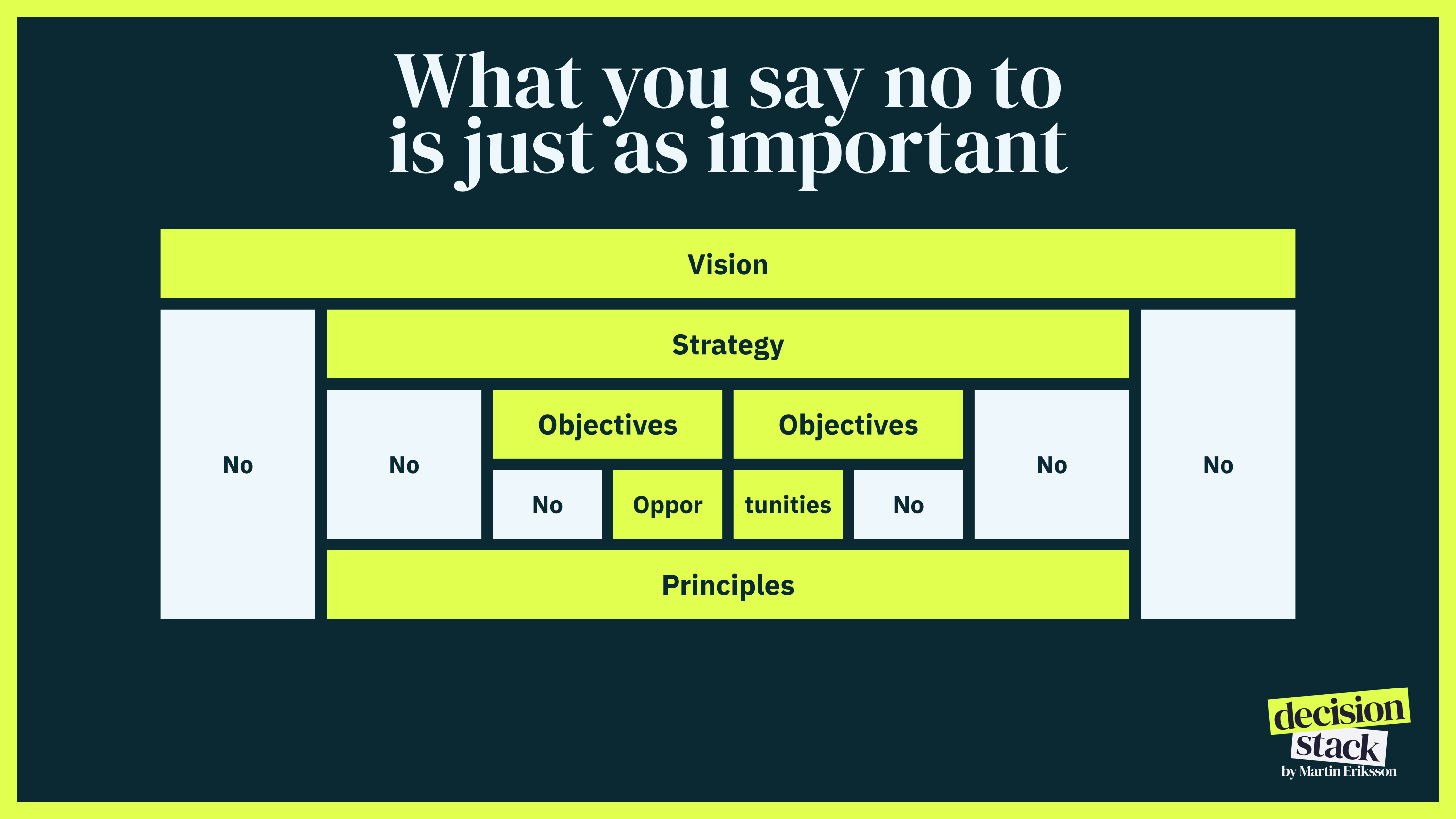 What you say no to is often more important than what you say yes to. The most successful organizations aren't the ones that say yes to everything. They're the ones that say no to almost everything, but say yes with full commitment to the few things that matter. The Decision Stack is how you tell the difference.
