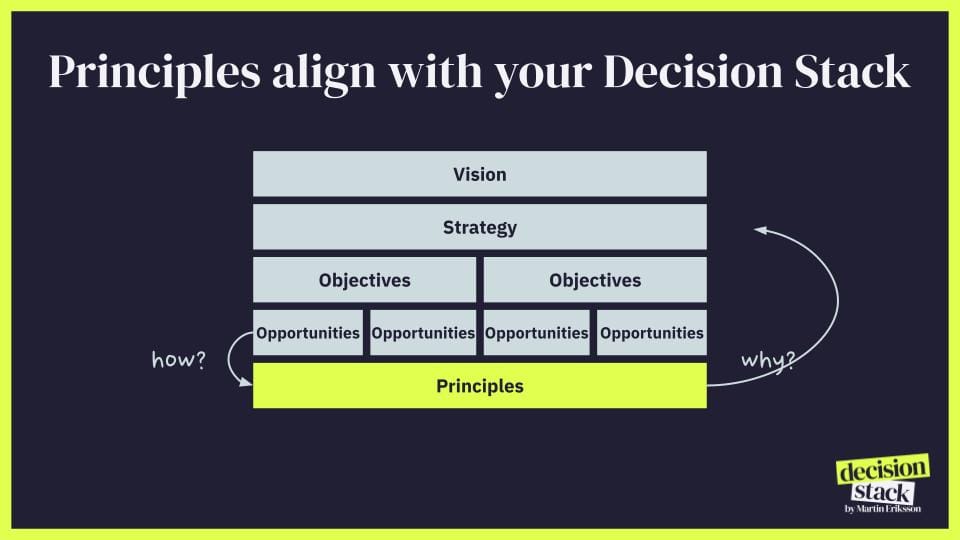 So your principles have to be a reflection of your vision and strategy - and have to help answer the questions "How are we going to build this" and "Why are we building this" at the same time.